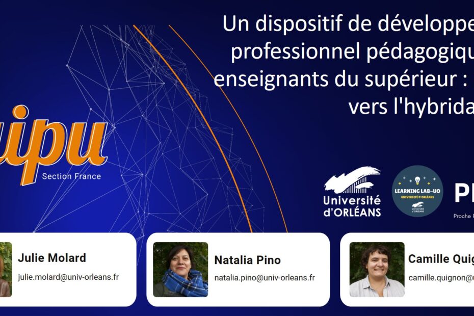Lors des journées d’études AIPU France 2023 qui se sont tenues les 30 et 31 mars, Julie MOLARD, Natalia PINO et Camille QUIGNON du Learning Lab-UO, ont présenté une communication sur les dispositifs hybrides de l’Université d’Orléans :